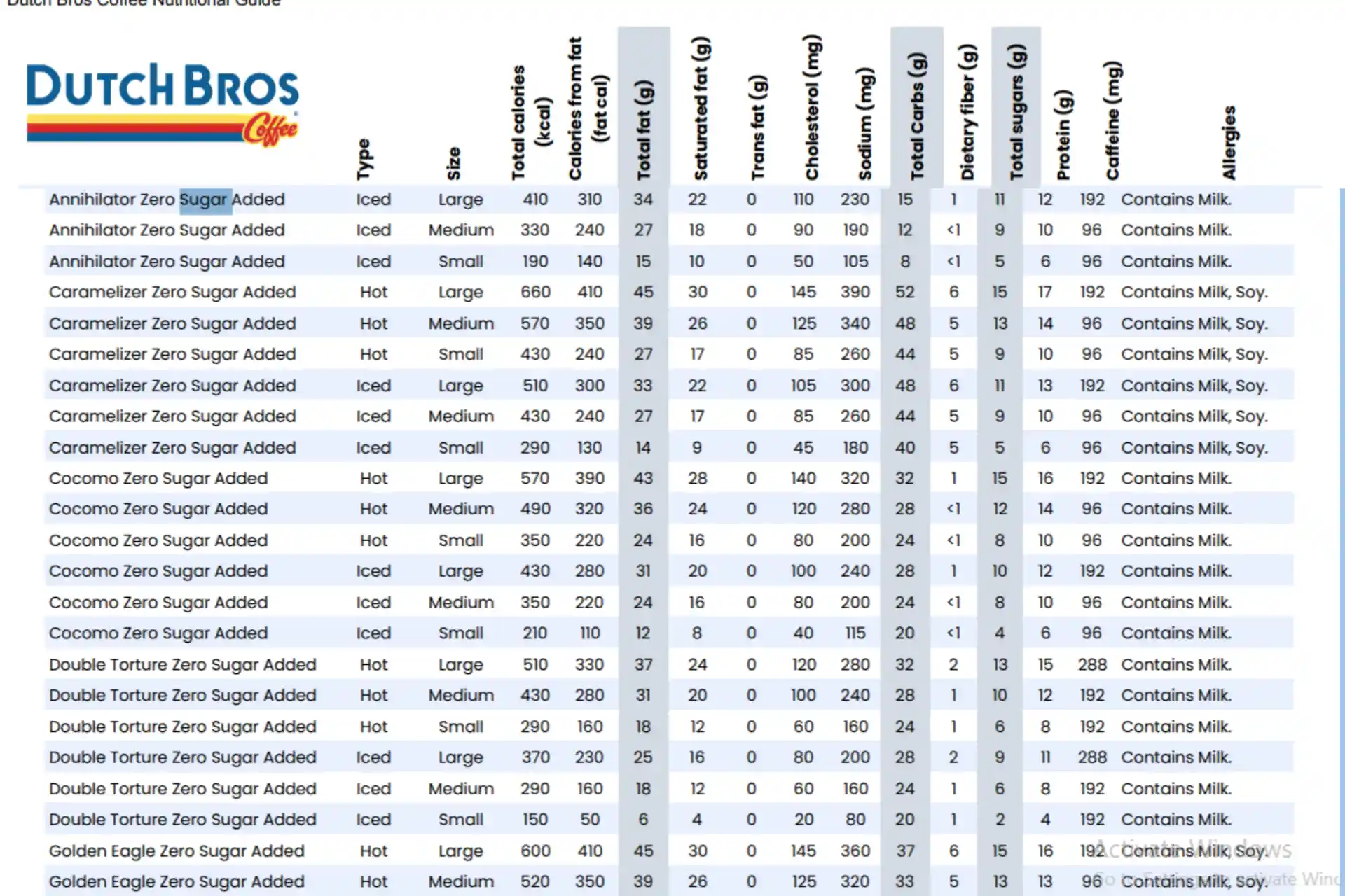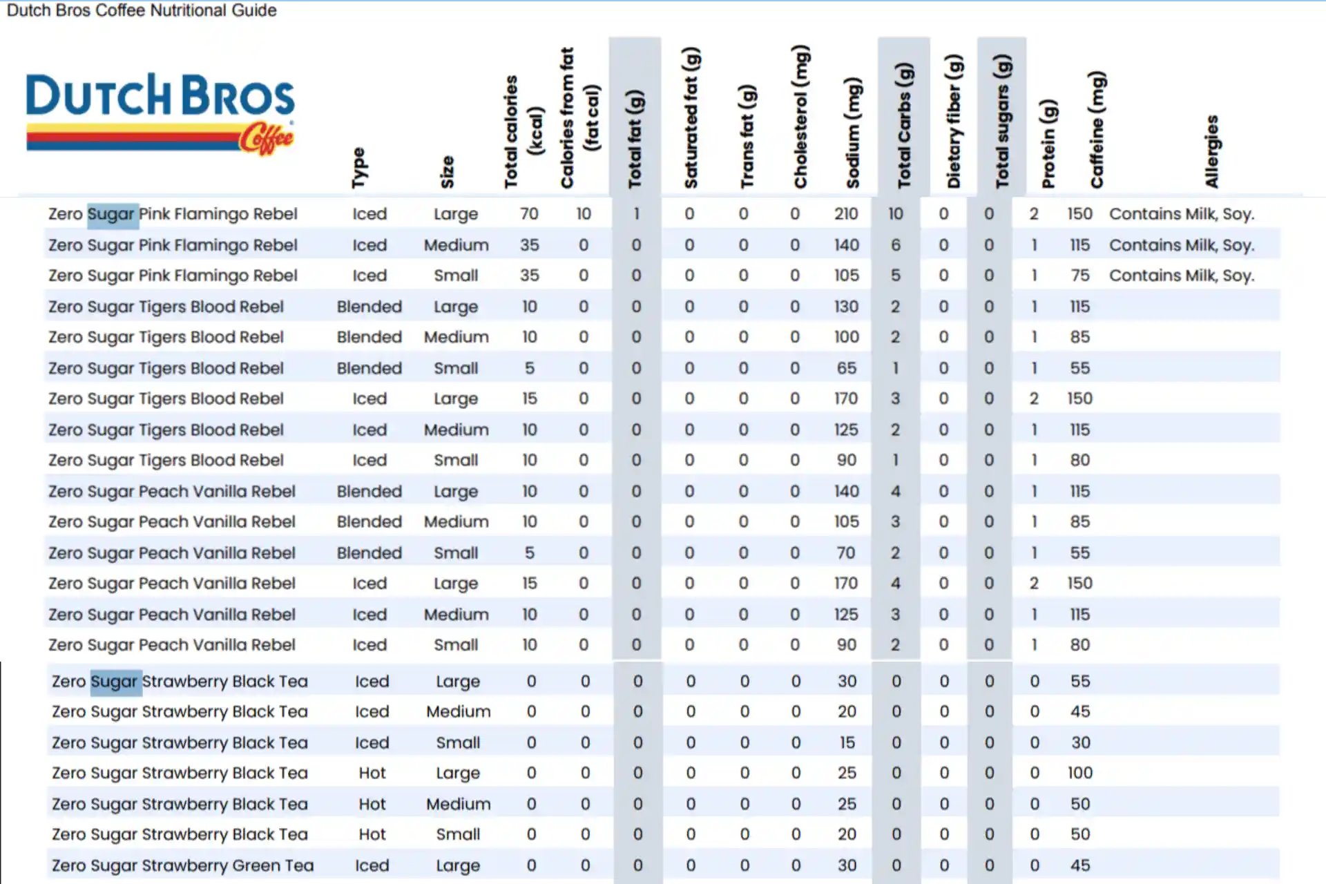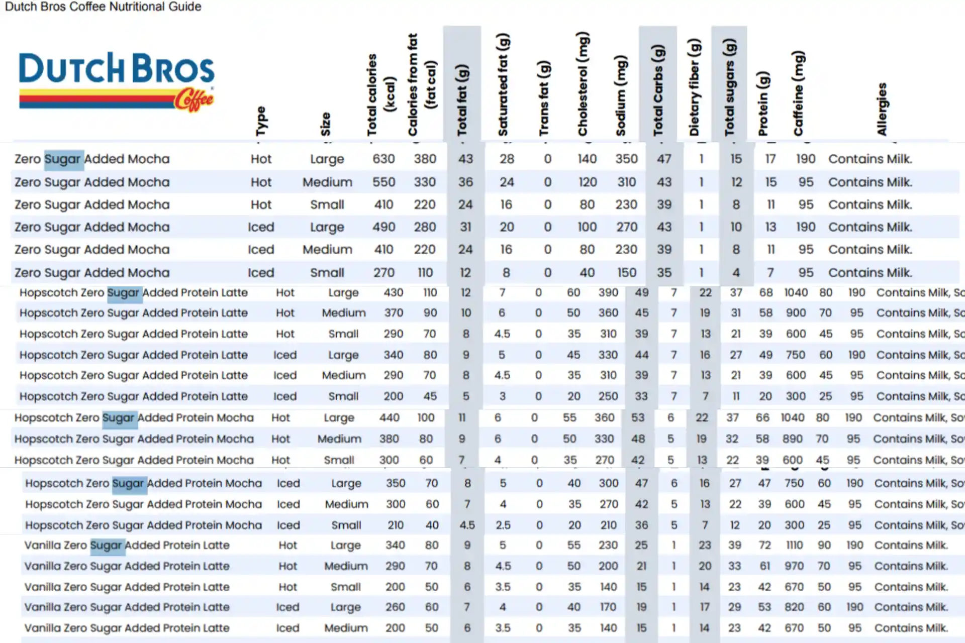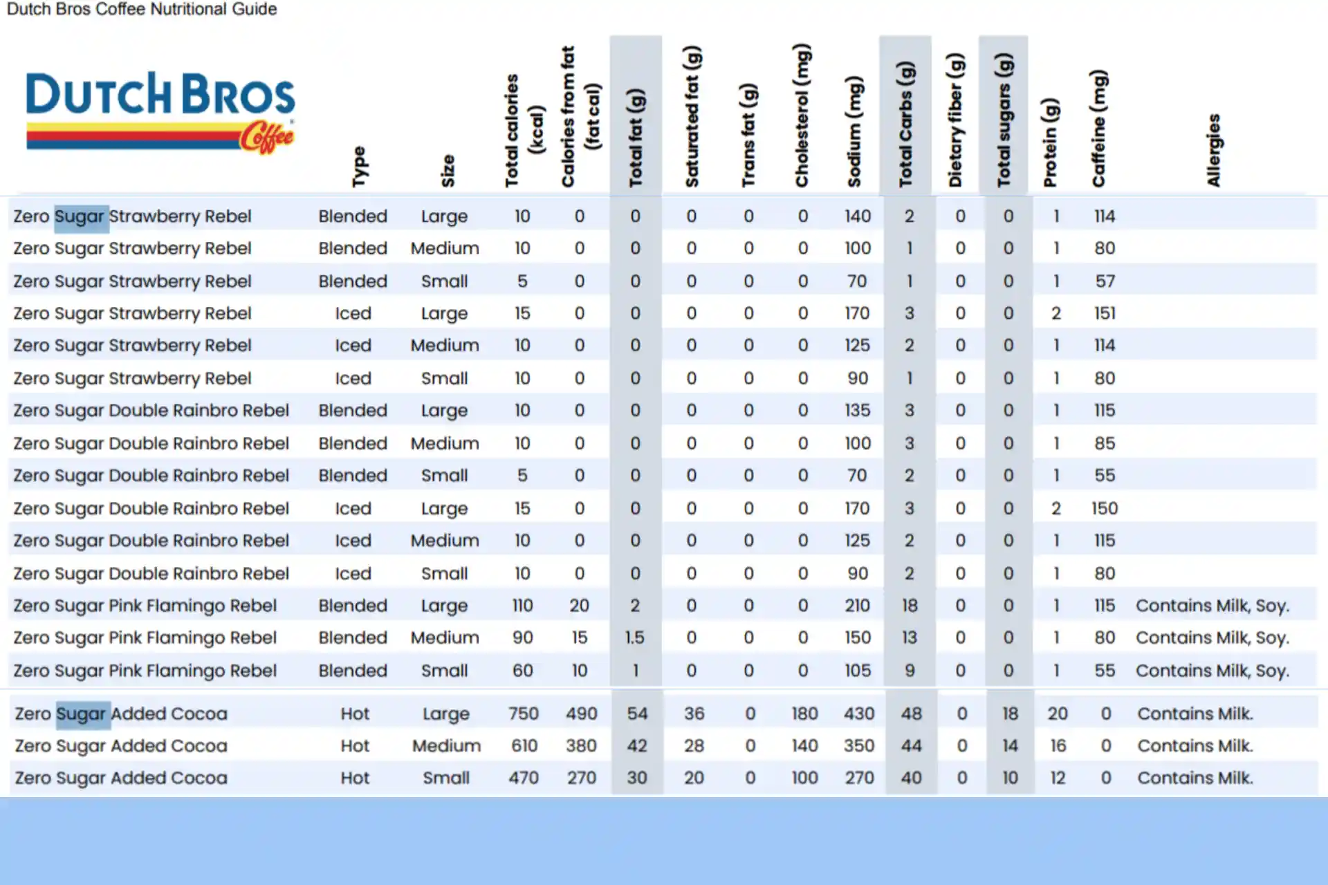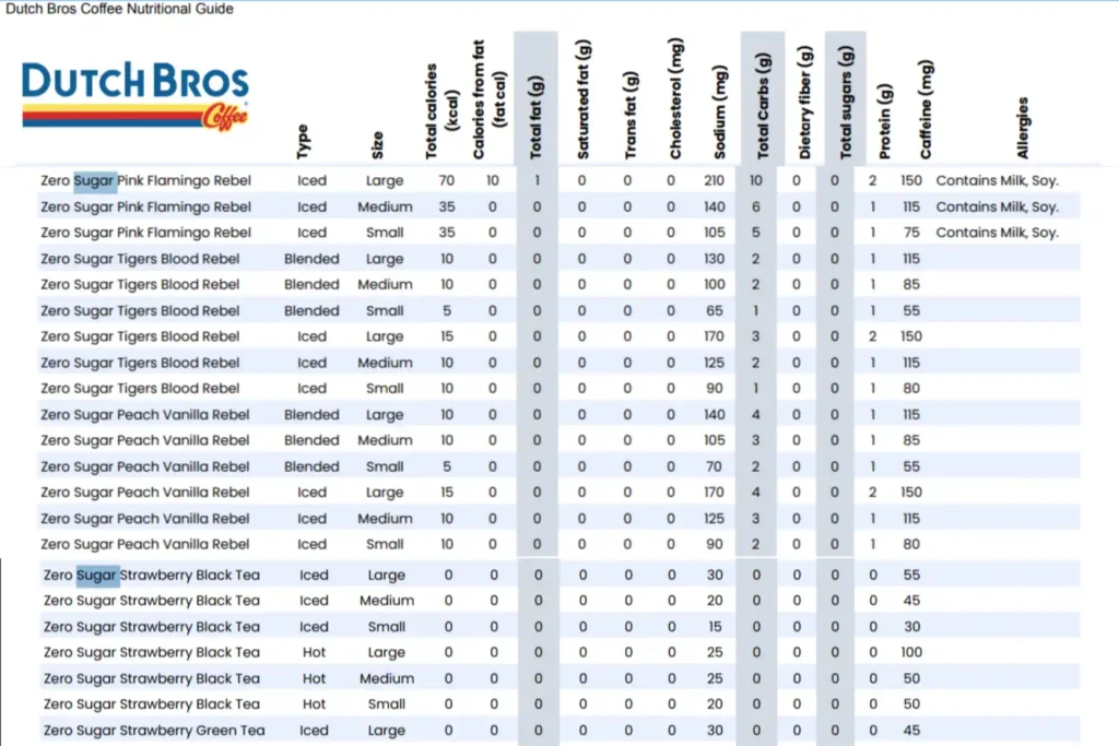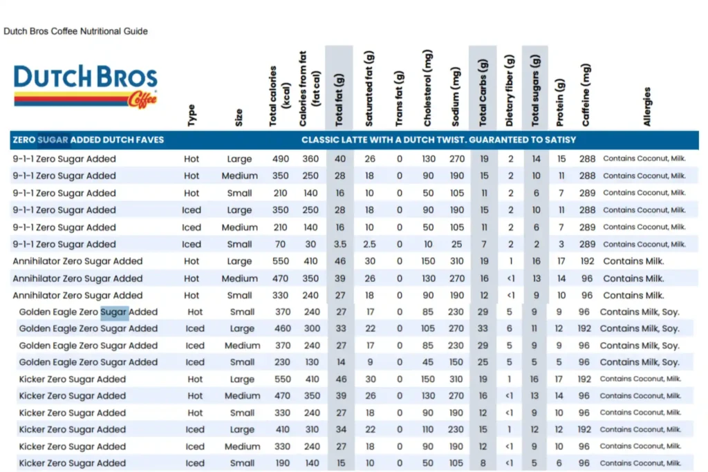 Here is the complete Dutch Bros Sugar-Free drinks Pdf to the nutrition guide.